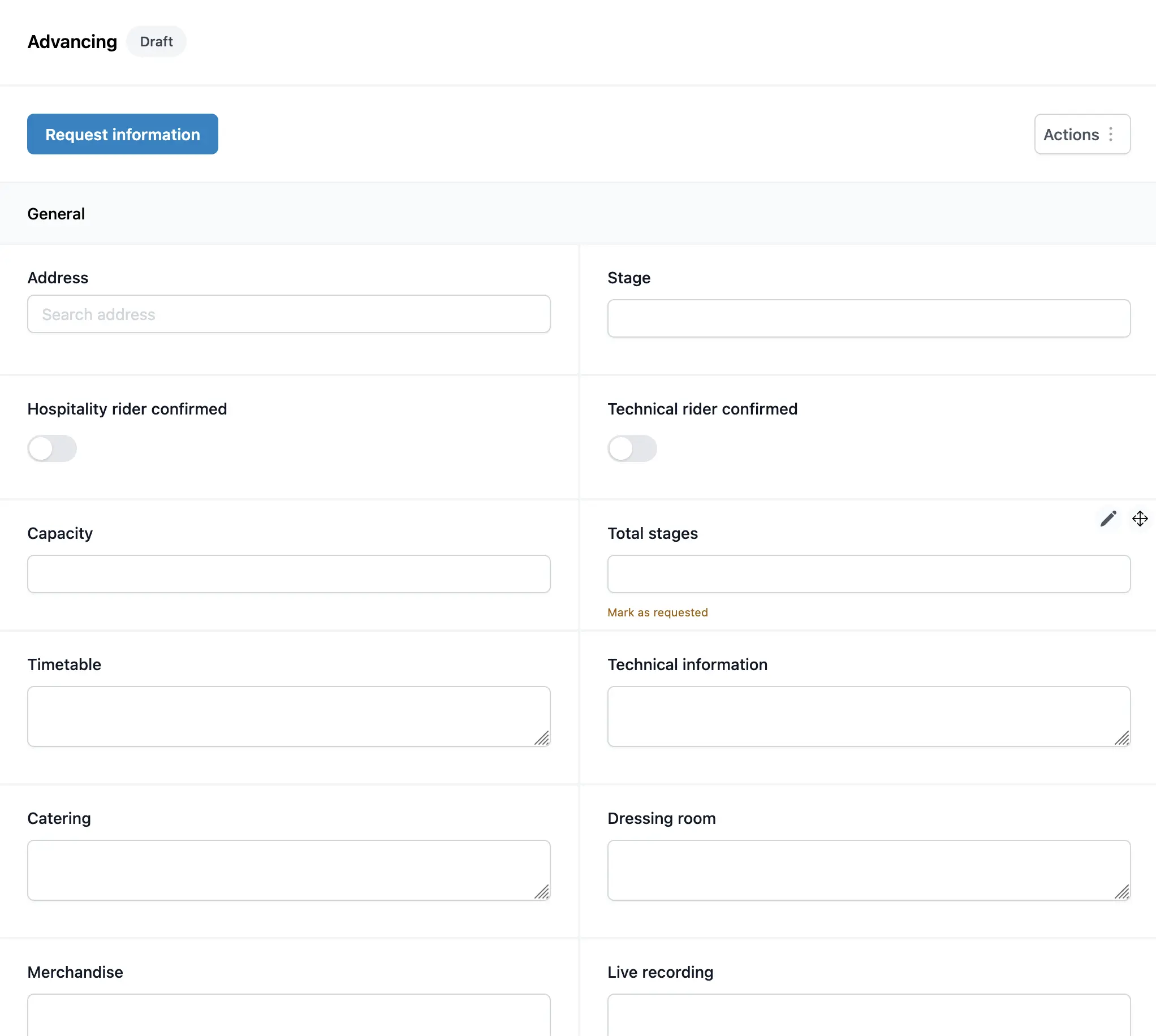 When you start advancing for a new booking, you can simply select one of your saved templates. This will automatically populate the advancing form with your pre-defined structure.