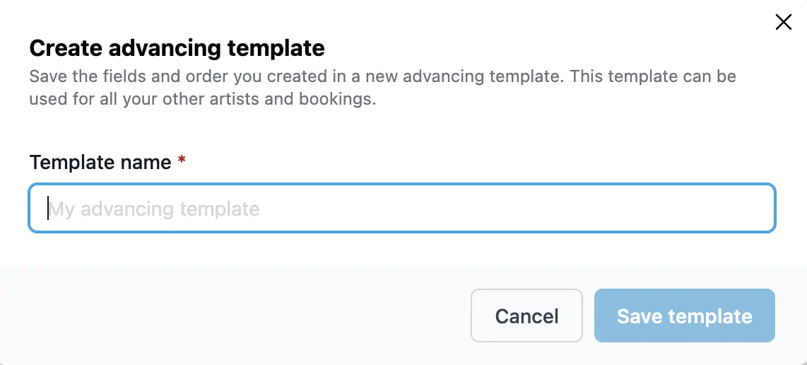 One of the most powerful features of Artistu's advancing system is the ability to save your customized field configurations as templates. This allows you to re-use them across multiple bookings, saving you significant time and ensuring consistency.