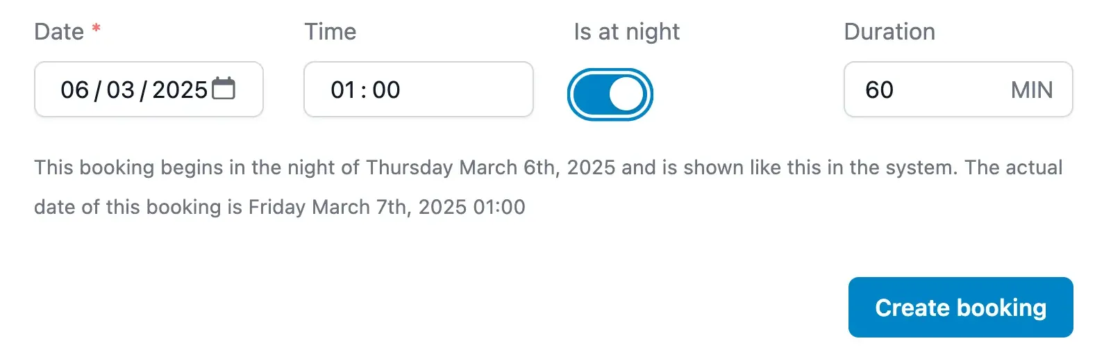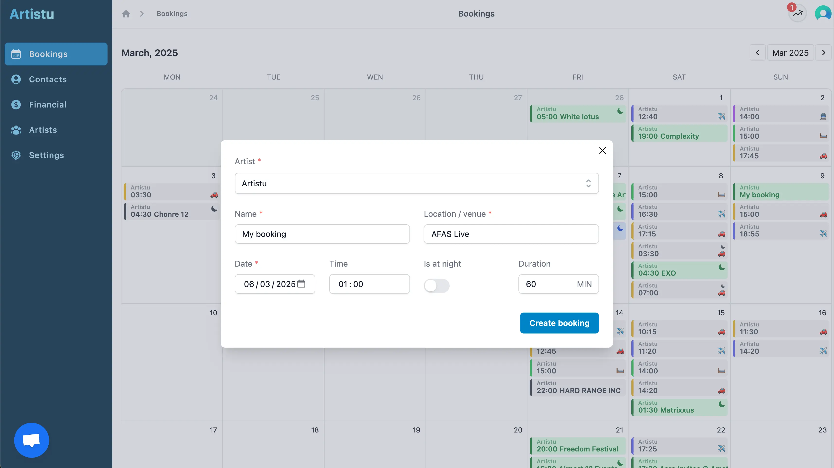 And example of this is setting the date to March 3rd at 02:00AM and selecting "at night" as the booking time. Artistu will then create a booking for March 4th at 02:00AM, the next night.