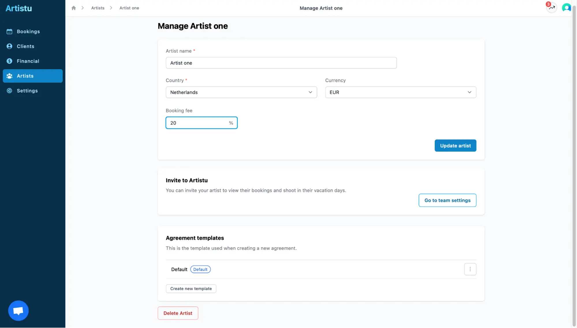 Artist profiles store agreement templates, currencies and the booking fees per artist.