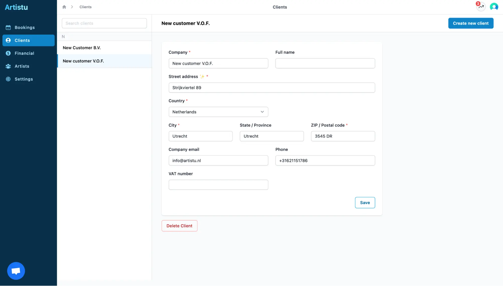Artistu allows you to add all relevant contacts and their information to the system. When creating bookings, client details can be re-used to speed up your workflow.