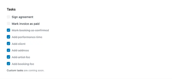 Each booking includes a task checklist to ensure every part of the booking is completed. The task list includes:
